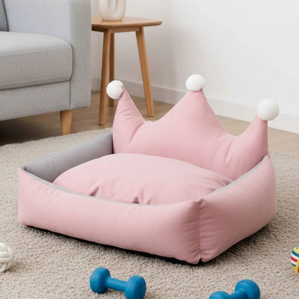 This crown-shaped pet bed offers a royal retreat for your furry companion, combining comfort and playful design. Made from soft suede with a crystal velvet interior, it provides plush support for small to medium dogs. The raised sides create a secure enclosure, helping pets relax and rest soundly.
